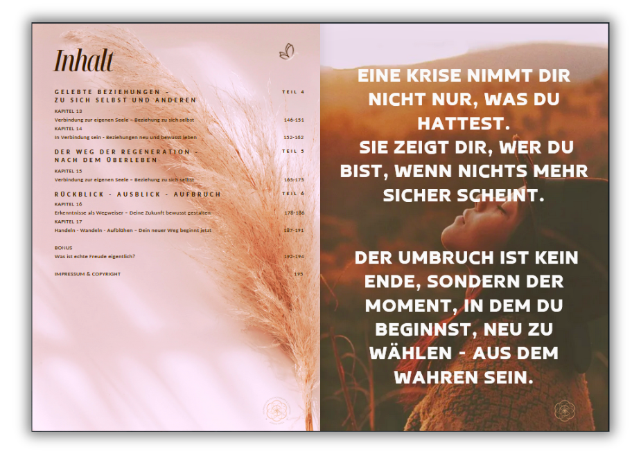 Ich habe dieses Buch geschrieben, um dich zu ermutigen. Um dir zu zeigen, dass du nicht allein bist. Und dass es möglich ist, aus einer tiefen Krise gestärkt, klar und auf neue Weise lebendig hervorzugehen. Schritt für Schritt. Mit Herz. Mit Verstand. Und mit einem neuen Bewusstsein für das, was wirklich zählt.